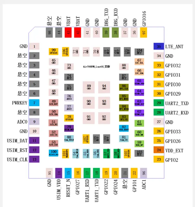 Air780EPM模组共支持38个GPIO和3个WAKEUP唤醒管脚。