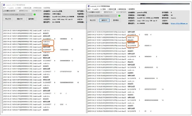方式二:一个开发板为节点A,一个开发板为节点B,互相发送数据接收对方的数据。