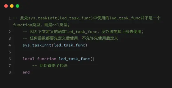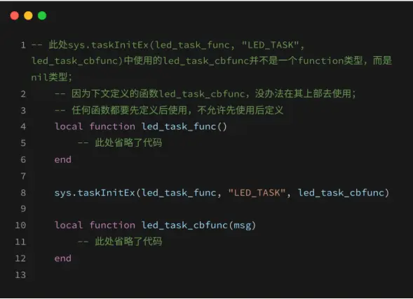 在回调函数内部无法使用sys.wait(timeout)、sys.waitUntil(msg, timeout)、sys.waitMsg(task_name, msg, timeout)等必须用在task中的函数。