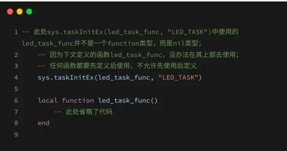 可以在能够执行到的任意代码位置使用此函数;高级task的定义,参考本文第一章节的描述;在LuatOS中,对创建的task数量没有特别限制,只要ram够用,可以一直创建。