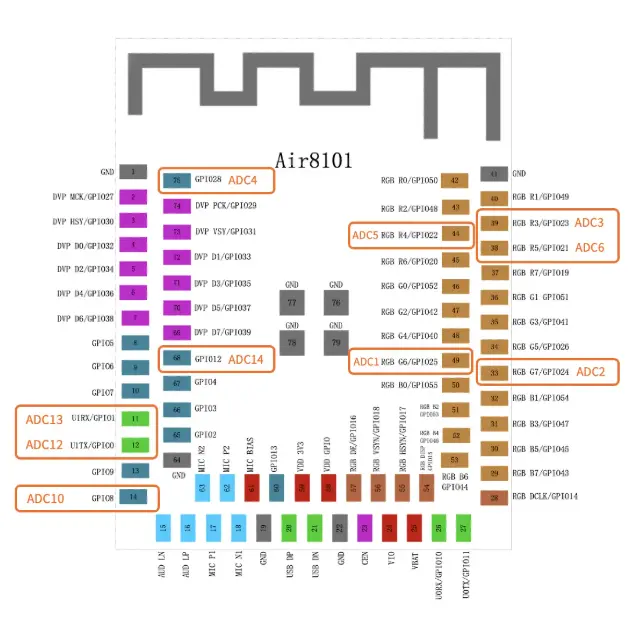 Air8101有10路外部ADC,相关管脚参考下图橙色方框标注: