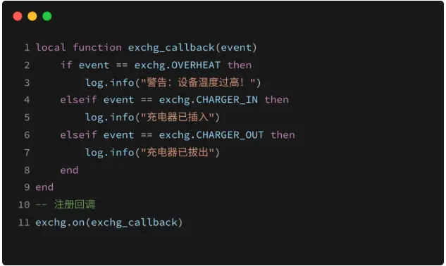 回调时传入参数有:exchg.OVERHEATexchg.CHARGER_INexchg.CHARGER_OUT