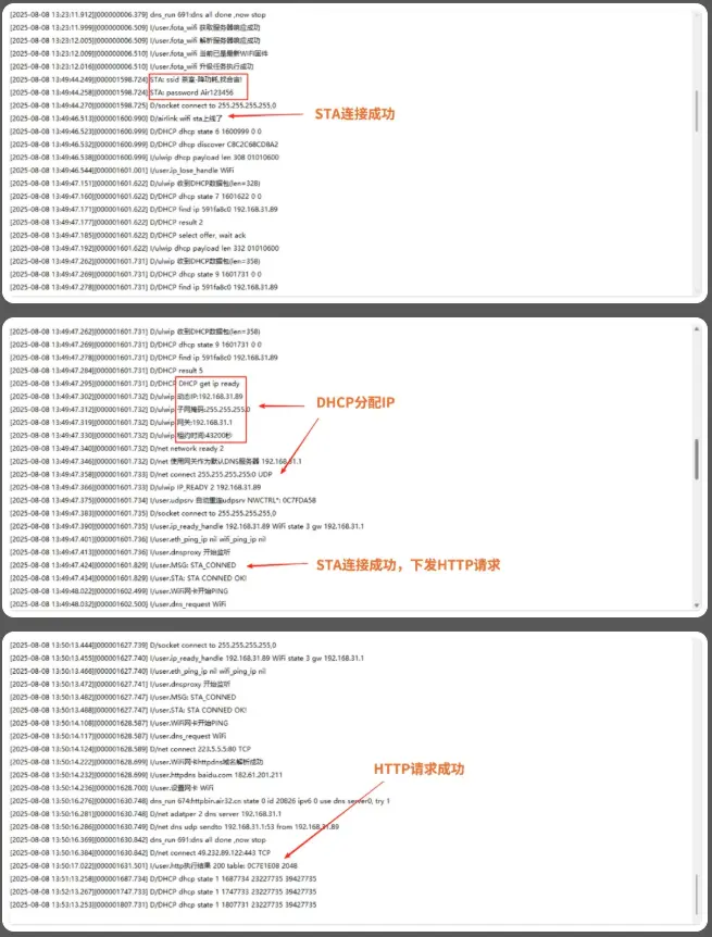 5)此时查看日志,即可看到STA已经连接成功,并且进行HTTP请求成功。