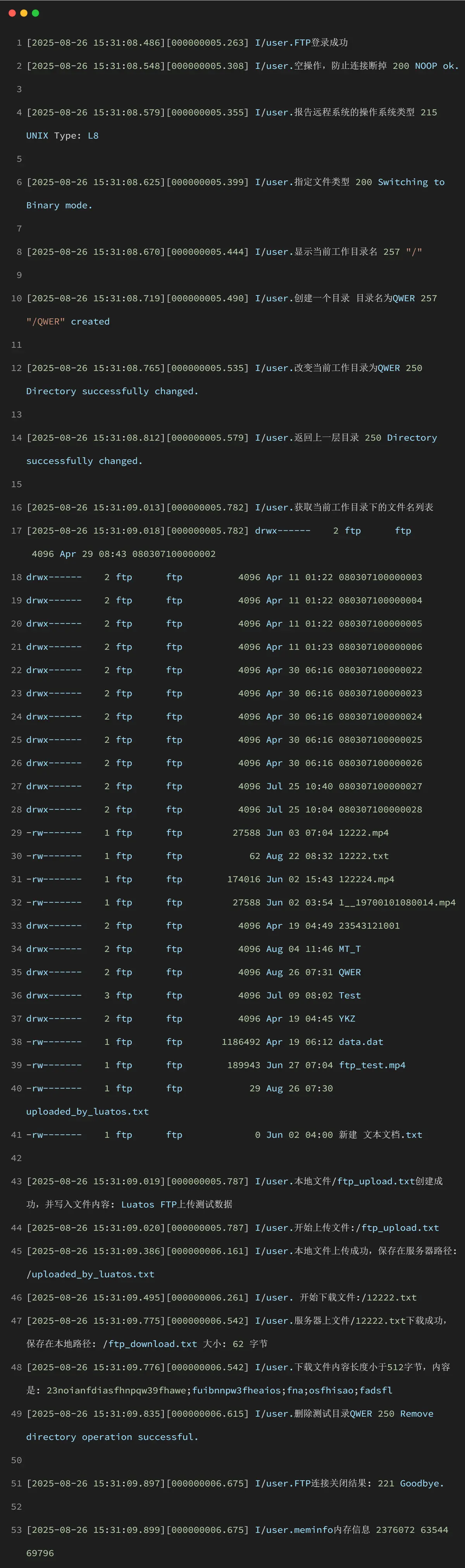 8、烧录成功后,自动开机运行,查看打印日志,如果正常运行,会打印 ftp 登录成功,文件目录,上传下载文件结果等信息。
