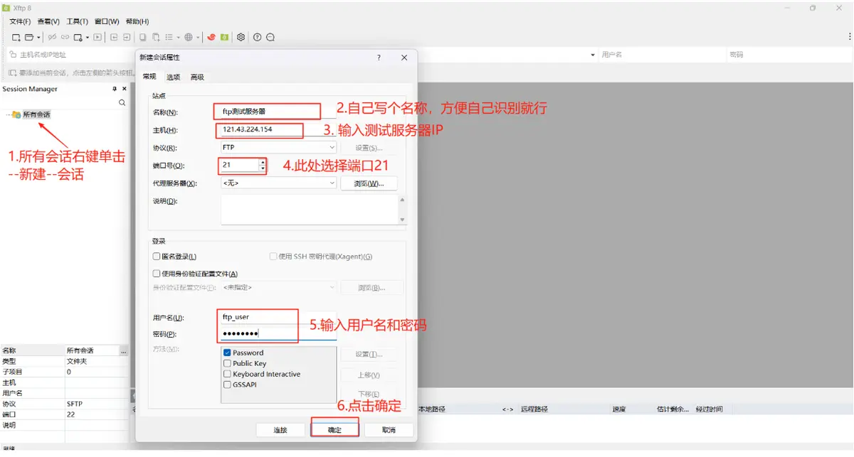注意选择 FTP 协议,如果新建会话后无法打开会话,可以再次检查登录信息是否正确。