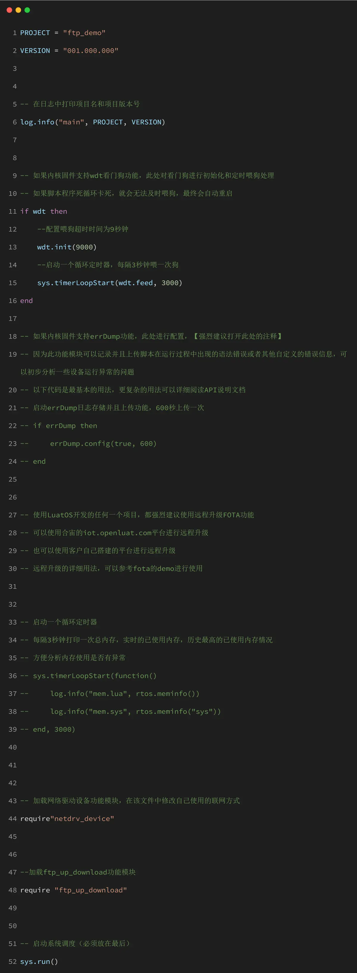 使用 Air780EPM 开发板下载 Air780EPM 的 LuatOS 示例代码中 ftp 的例程,进行验证,例程中实现的功能核心业务逻辑为: