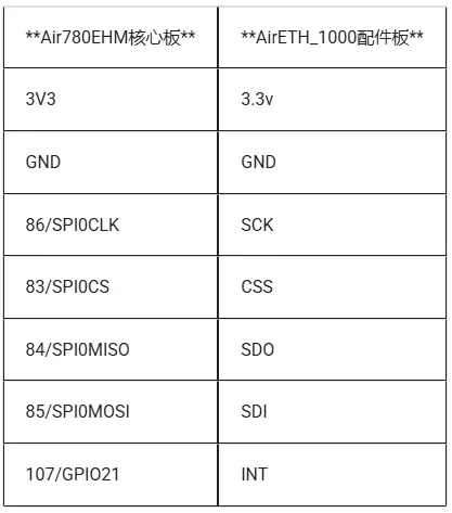 9、可选 AirPHY_1000 配件板一块,Air780EHM 核心板和 AirPHY_1000 配件板的硬件接线方式为: