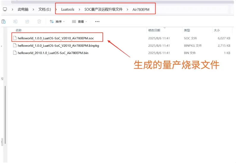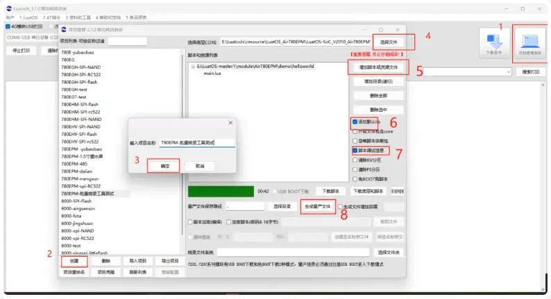 运行LuaTools工具,按图示步骤生成量产烧录文件;在 LuaTools安装路径的文件夹,可查看生成的量产烧录文件。