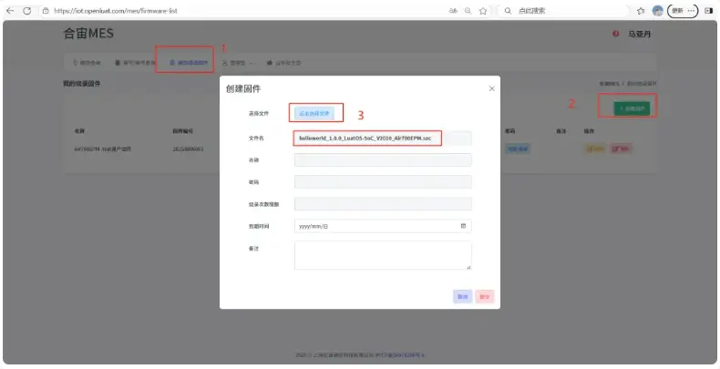 按下述步骤上传文件:我的烧录固件→创建固件→点击选择文件;