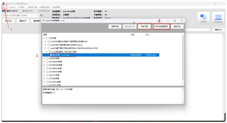 公共资源→LuatOS量产刷机工具→v1.0.2 测试版本→默认资源,勾选默认资源前的方框,点击下载。