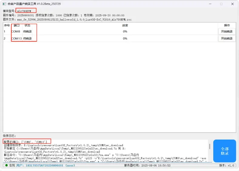 点击开始烧录,烧录单个端口对应的模组;或者点击全部烧录,会烧录当前所有配置好的模组。