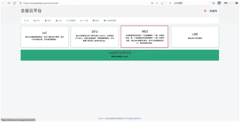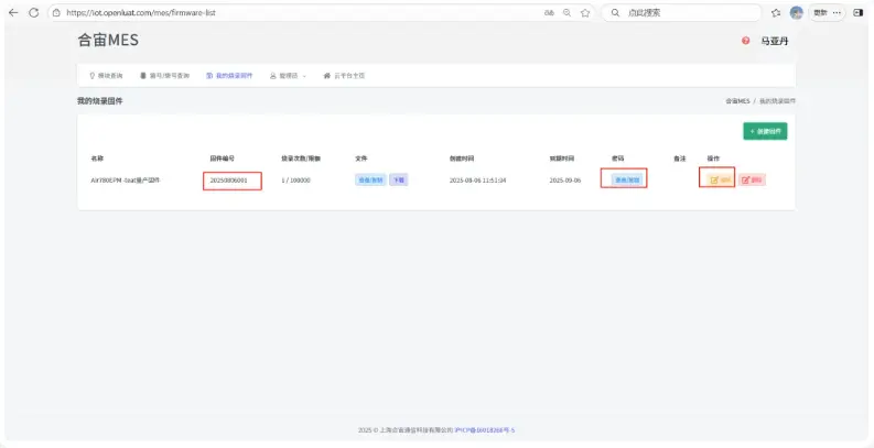 登录IoT平台后,找到MES板块,点击进入:我的烧录固件→创建固件