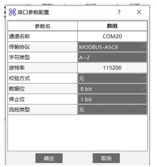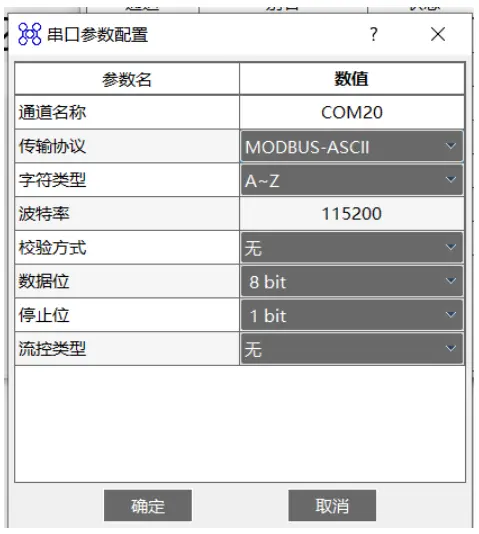 5.点入配置,按照代码中 uart.setup 设置参数后,选择 ASCII 传输协议,点击确定即可,设置完毕后在通道管理界面配置的通道显示属于正常状态。用户如果接的是自己的下位机,请将 uart.setup 传入的参数成自己下位机的配置参数。