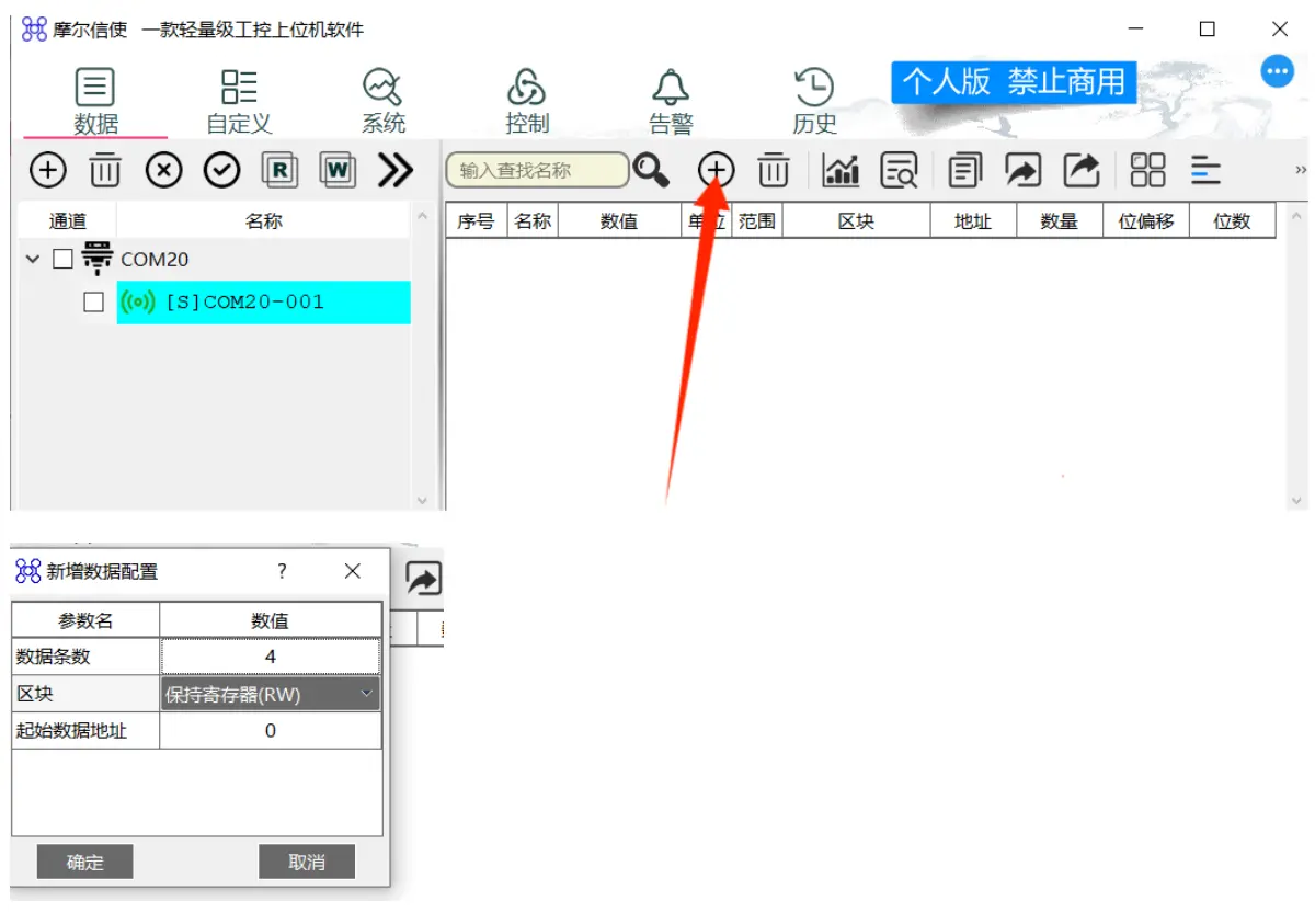 8.增加数据配置,根据需要选择寄存器或线圈数据。