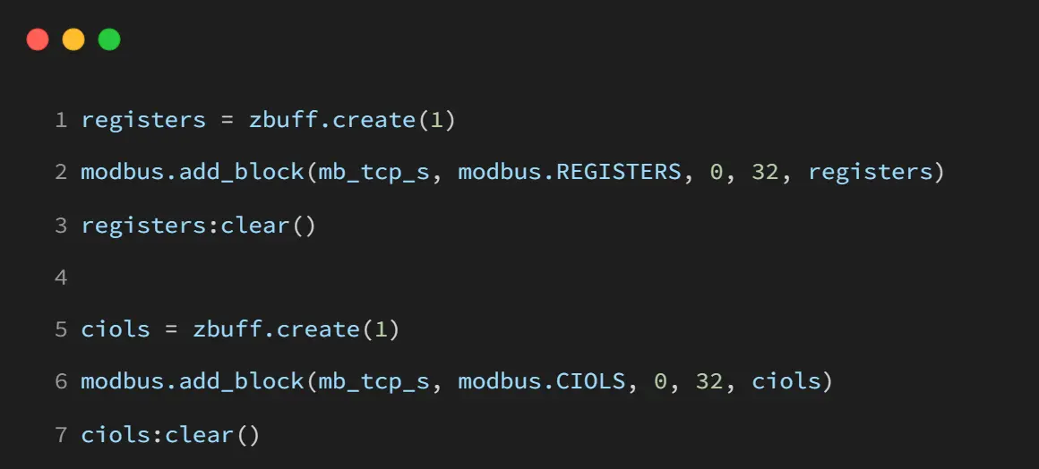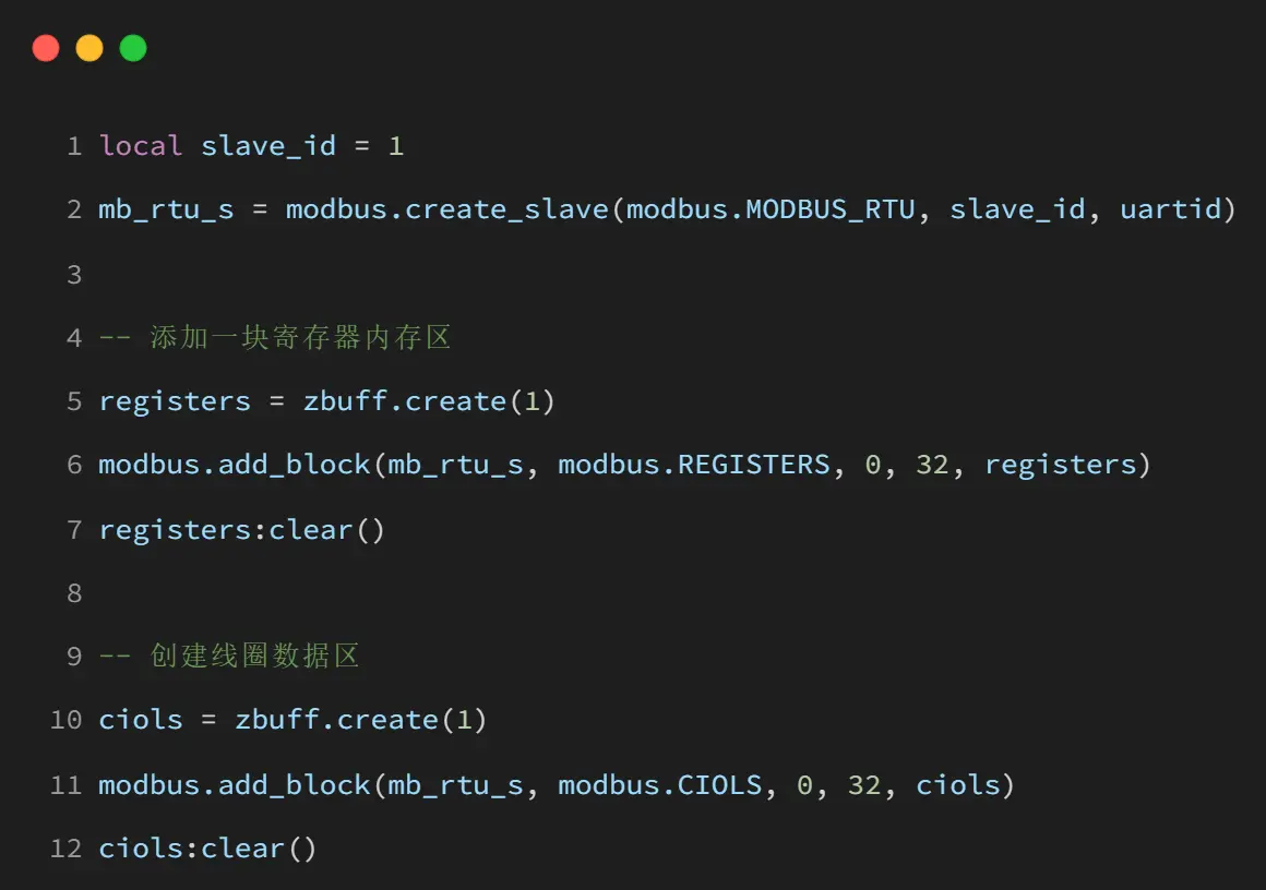 2.Modbus 从站创建:创建了一个 RTU 模式的 Modbus 从站,添加了两个数据块:保持寄存器区和线圈区