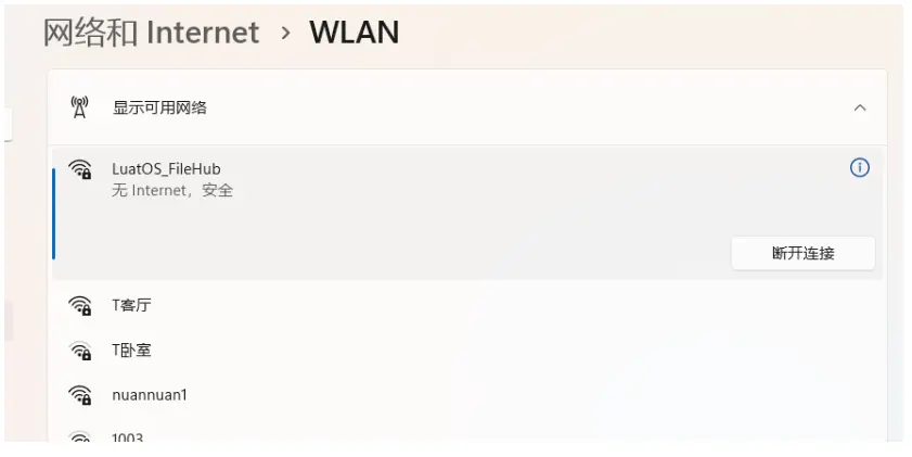 使用手机或电脑搜索并连接名为 LuatOS_FileHub 的 WiFi 热点,密码为 12345678