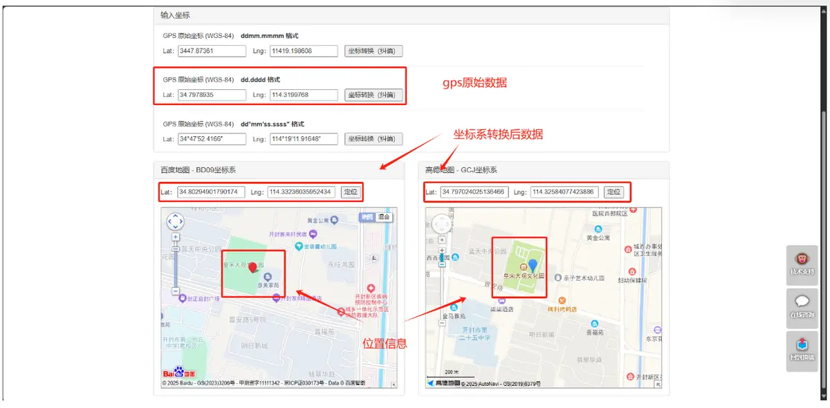 将定位成功后的经纬度复制到此页面:https://www.openluat.com/GPS-Offset.html。可以查看位置信息和坐标系转换后的经纬度。