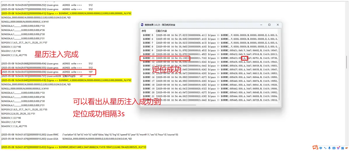 可以看到没有使用 agps 辅助定位需要 31 秒左右才能定位成功。使用 agps 后,注入星历数据后 3s 左右就能定位成功