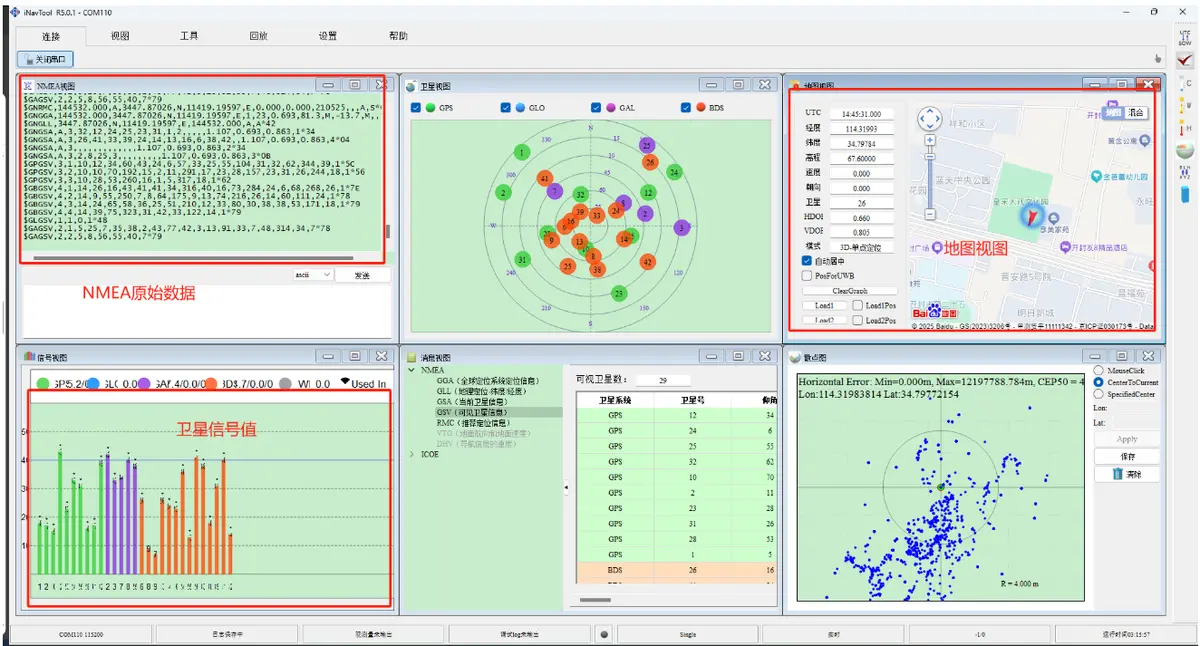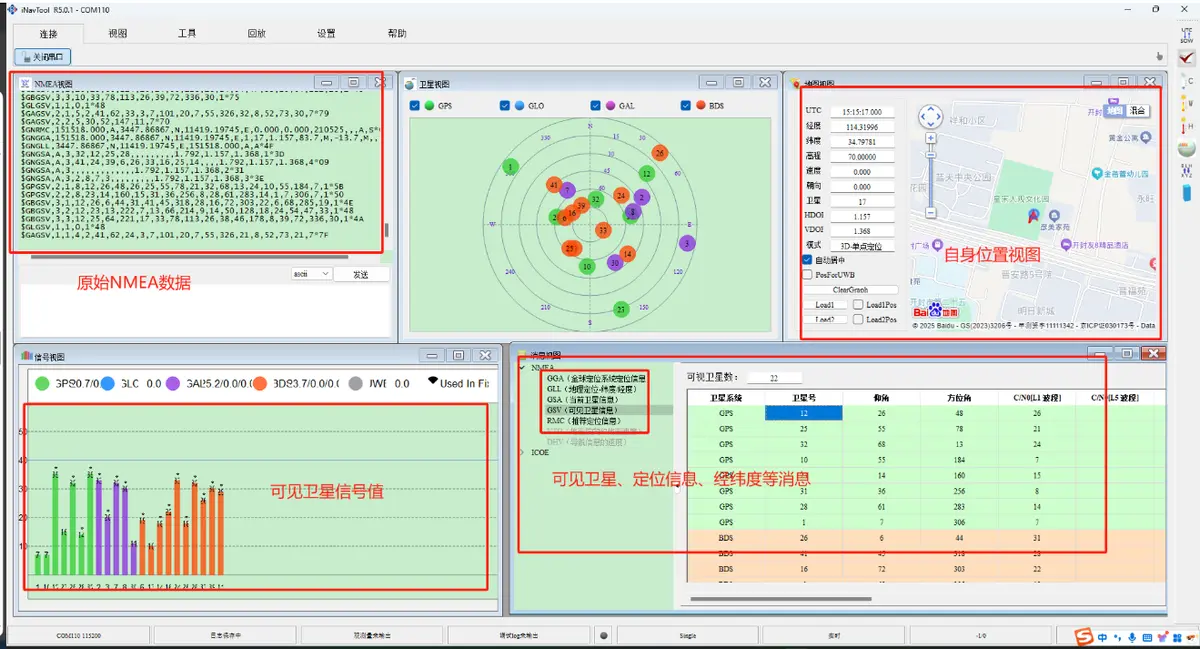 如果不满足只是查看当前 CN 值、可见卫星数、当前经纬度对应坐标等信息,还需要测试 GNSS 性能,还要有个直观的展示界面,可以参考如下方法: