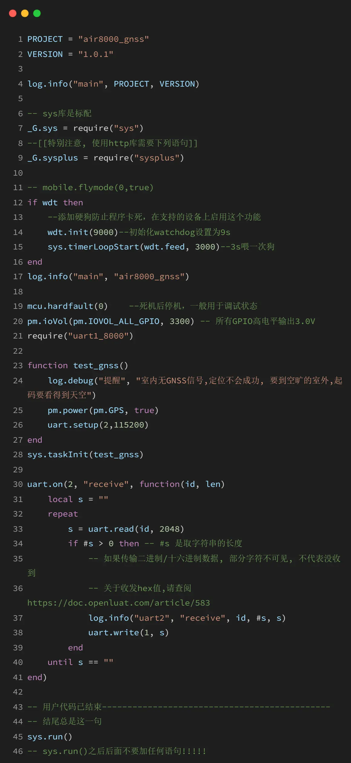 但是由于 Air8000 uart2 的 RX 被内部 Cat.1 芯片占用,无法直接发送命令给内部 GNSS 芯片,所以我们需要曲线救国一下,将 uart2 上的数据转发给 uart1,再将 uart1 收到的指令转发给 uart2,这样就能实现通过 uart1 给内部 GNSS 芯片发送指令,并且通过 uart1 观察 GNSS 芯片吐出的 NMEA 数据,来分析 Air8000 内部 GNSS 芯片性能的目的了