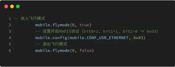 注意事项:控制设备的USB以太网卡功能,通过位操作来控制不同的功能;仅在开启前可以修改;bit2:协议选择(1ECM协议,0RNDIS协议);必须在飞行模式下设置才能生效。