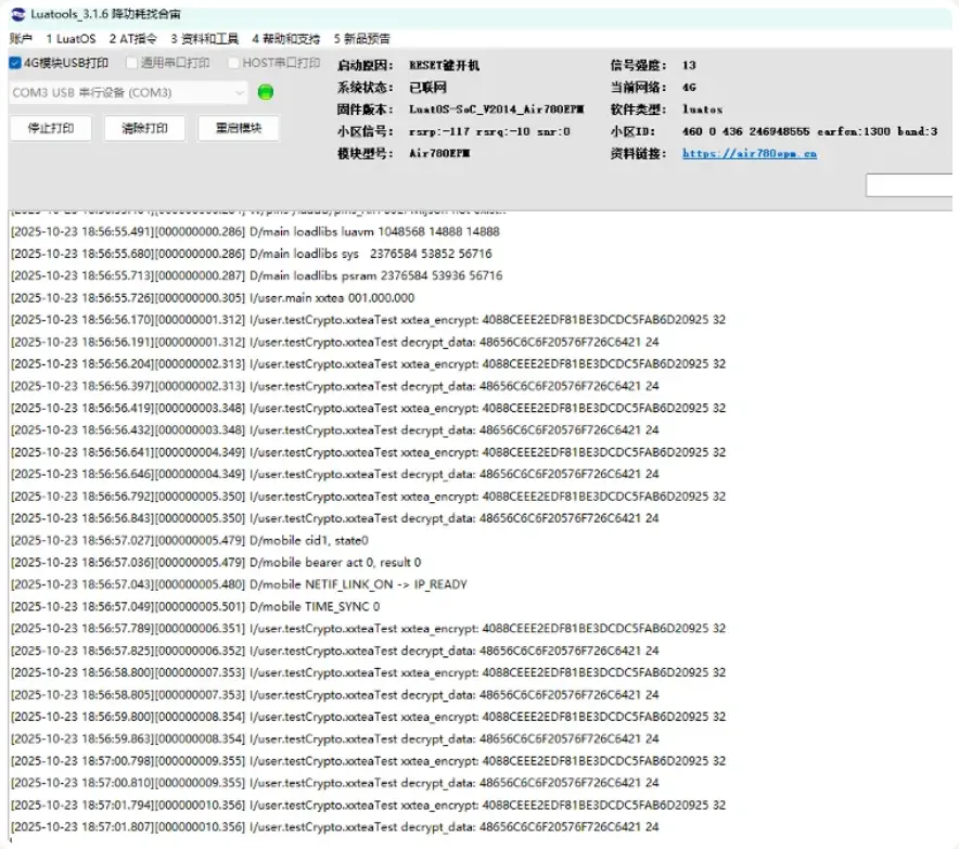 Air780EPM应用示例持续更新中,本示例demo核心功能为:使用XXTEA加密算法,对数据进行加密和解密。