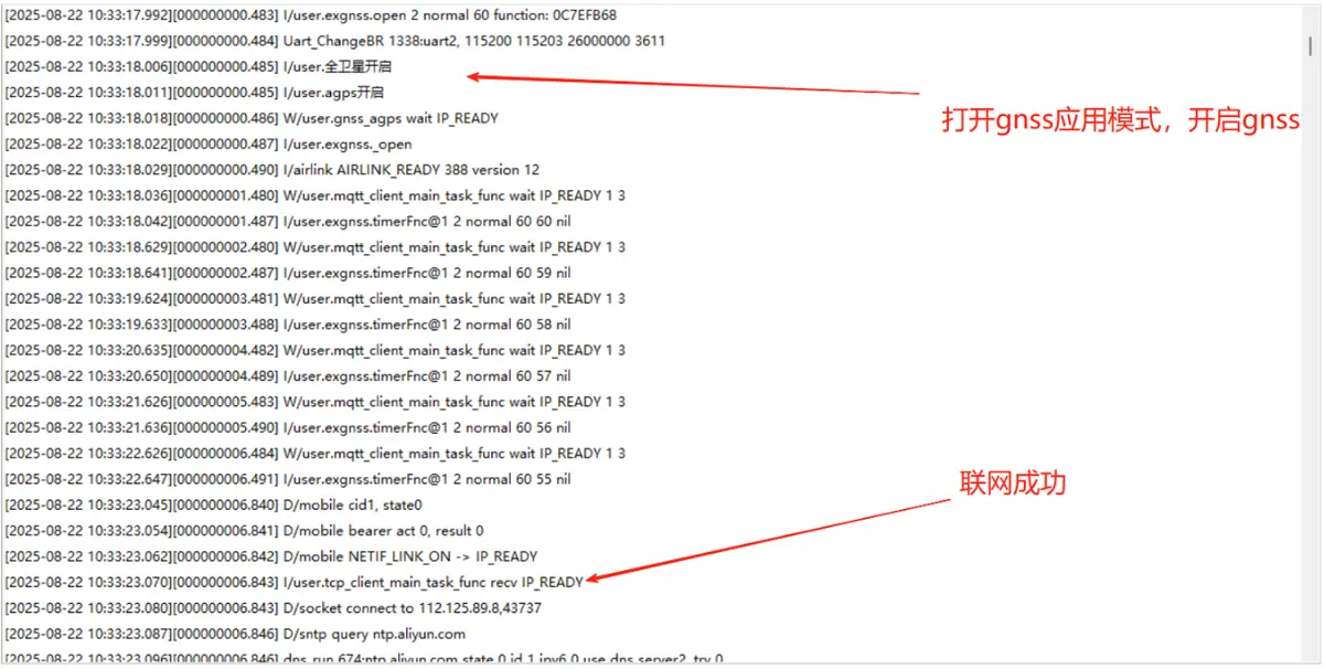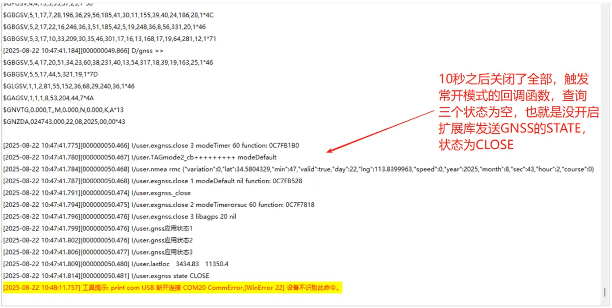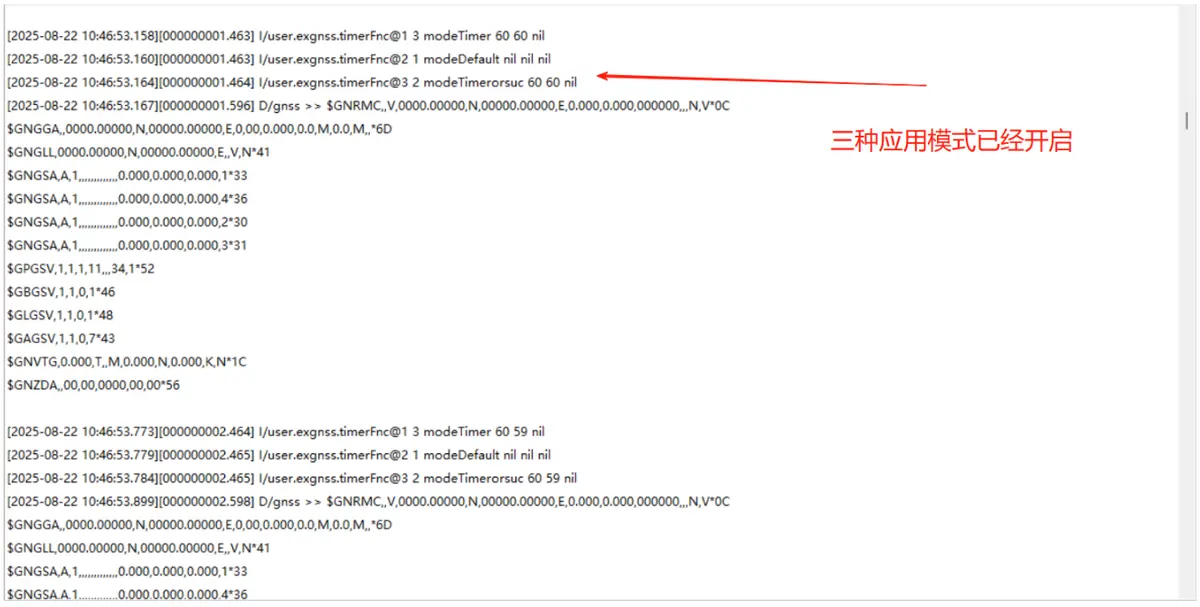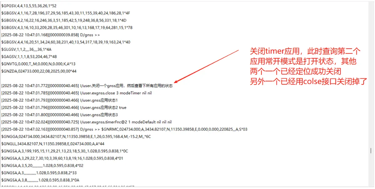 关于应用需要注意的是:使用 exgnss.close()关闭的只是对应的应用,所有应用关闭,gnss 也会关闭,这样做的好处是可以处理不同场景下的不同逻辑,比如服务器下发一条定位指令,定位成功之后关掉,这个时候又下发了一个指令需要长开启定位,这样两种指令就会冲突,需要代码去处理到底是不是要关掉 gnss,这个时候应用的好处就体现出来了,开启 exgnss.TIMERORSUC 第一个应用,定位成功之后关掉对应的应用,同时开启 exgnss.DEFAULT 第二个应用,gnss 就会常开,在应用 1 结束之后,只会对应用进行自动关闭,不会影响到第二个应用,gnss 还会处于常开状态。
