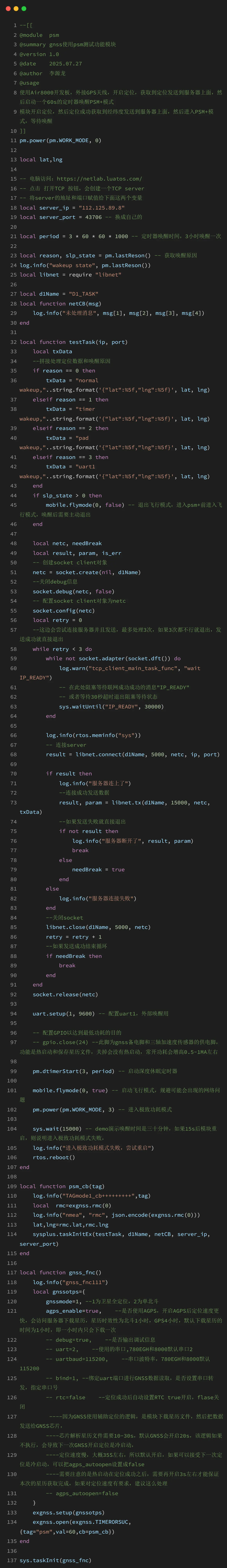 2.通过 exgnss.open 开启 exgnss.TIMERORSUC 应用模式,设置的 tag 为 psm,定位时间为 60s,回调函数为 psm_cb,这个模式定位成功之后会关掉 GNSS,然后触发回调函数,回调函数的操作为,通过 exgnss.rmc(0)接口获取 rmc 数据,获取经纬度并赋值变量,然后使用 sysplus.taskInitEx 开启 TCP 短连接协程,连接服务器发送经纬度消息和唤醒消息内容。