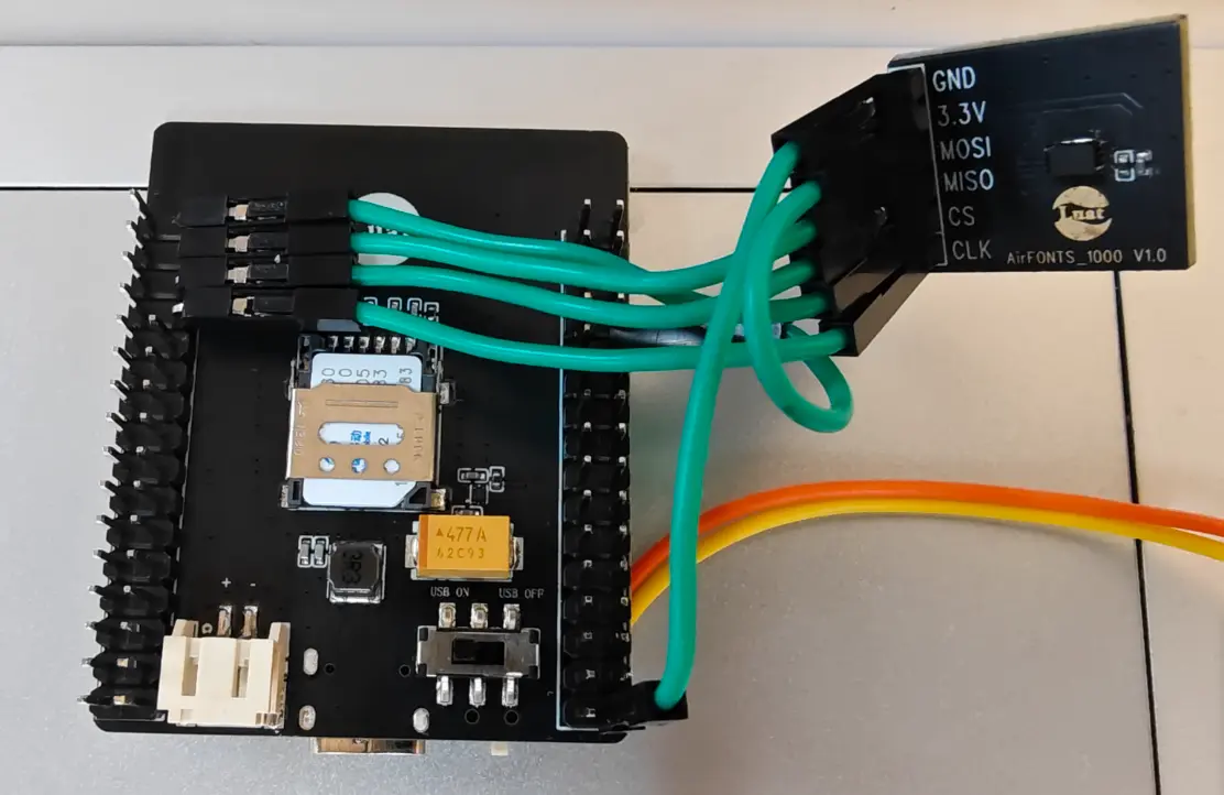 为了演示方便,所以 Air8000 核心板上电后直接通过 vbat 引脚给 AirFONT_1000 配件板提供了 3.3V 的供电;