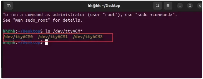 使用 ls /dev/ttyACM* 即可看到三个端口: