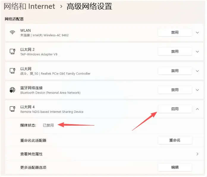 如果启动后日志中打印RNDIS启动成功,但是Windows上没有连上网络,需要确认下系统是否将RNDIS的虚拟网卡禁用了。