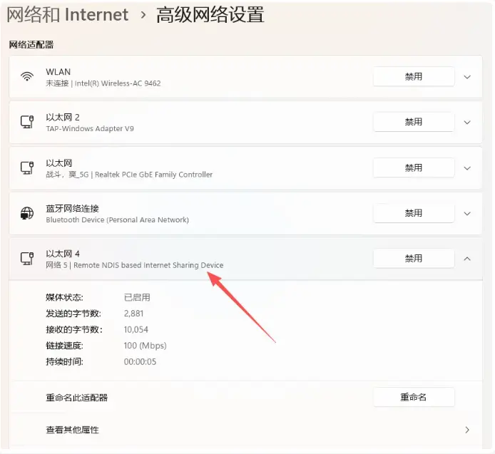 启用完毕后,即可看到我们电脑的图标已经变为以太网连接,此时可以正常使用RNDIS上网了。