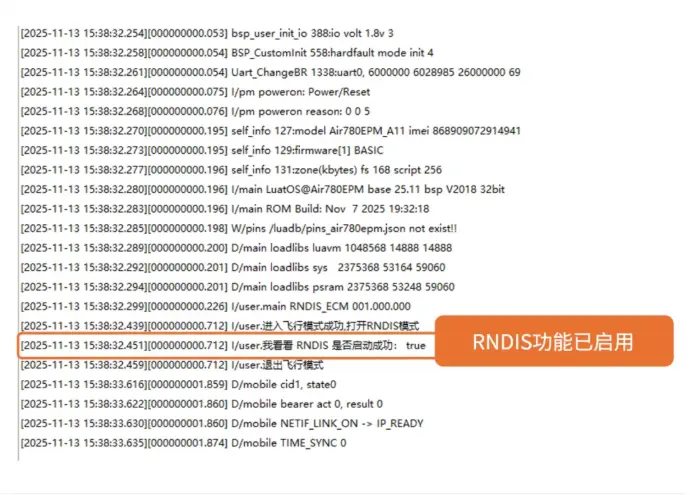 先用Luatools将相关代码烧录到模组中,通过日志来确认是否已经成功开启RNDIS功能: