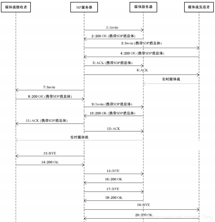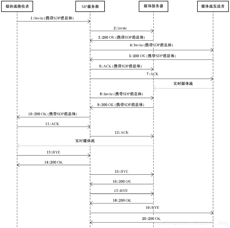 PS:其中,信令1、8、9、10、11、12为SIP服务器接收到客户端的呼叫请求后通过 B2BUA 代理方式建立媒体流接收者与媒体服务器之间的媒体流信令过程,信令2~7为SIP服务器通过三方呼叫控制建立媒体服务器与媒体流发送者之间的媒体流信令过程,信令13~16为媒体流接收者断开与媒体服务器之间的媒体流信令过程,信令17~20为 SIP 服务器断开媒体服务器与媒体流发送者之间的媒体流信令过程。