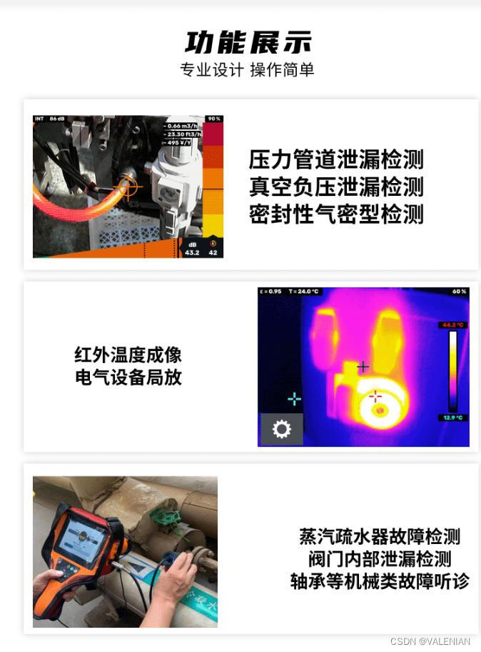 ◆祛水器及热交换器等蒸汽设备检测:使用超声波检测可说是最安全可靠的检测方法之一,使用探针接检触测能有效找出泄漏点或阻塞点,可大大增加设备的使用性能,昆山汉吉龙提供的LE4800plus具有祛水器自动诊断功能及红外热像仪功能及时诊断问题点。具有祛水器及热交换器等蒸汽设备检测和红外热像仪