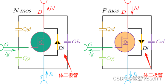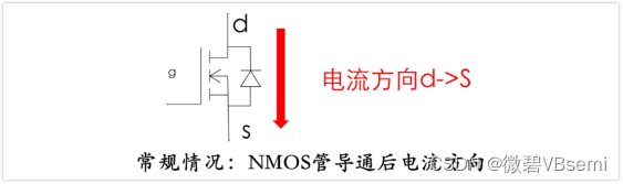当NMOS以电流为S—D的使用方式,用于开关使用时,当NMOS关断时,会有较大的电流在体二极管处通过,即图中的Di。这在实际应用中达不到开关的效果。