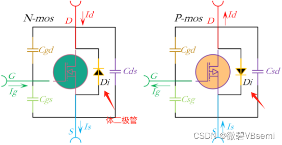 当MOS管进行开关使用时,导通时电流从MOS管的主体流过,也会有额外的电流流过同极性的体二极管(但只有少量)。