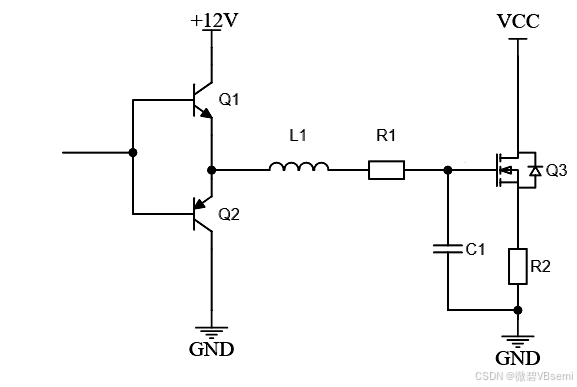 (如图所示)为了向MOS管提供足够驱动电流,一般会用推挽电路,如三极管 Q1、Q2。实际线路中会存在感抗和电阻,如图的等效电感 L1、等效电阻 R1,且 MOS 管 GD、GS 间有寄生电容(等效为 C1)。L1 和 C1就形成了谐振振荡电路,因 R1 极小无法起阻尼作用,导致在驱动脉冲上升沿、下降沿形成振荡波形。