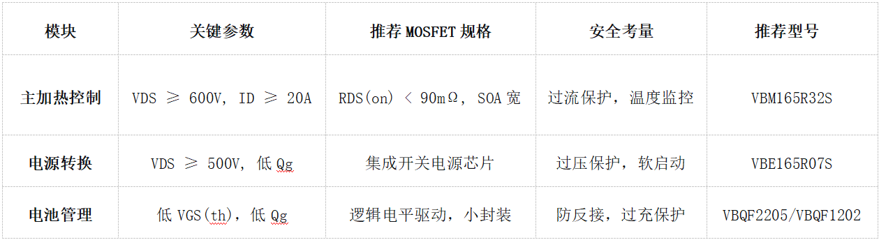 在不同电路模块中,MOSFET的参数选择各有侧重。以下是养生壶主要功能模块的MOSFET需求分析: