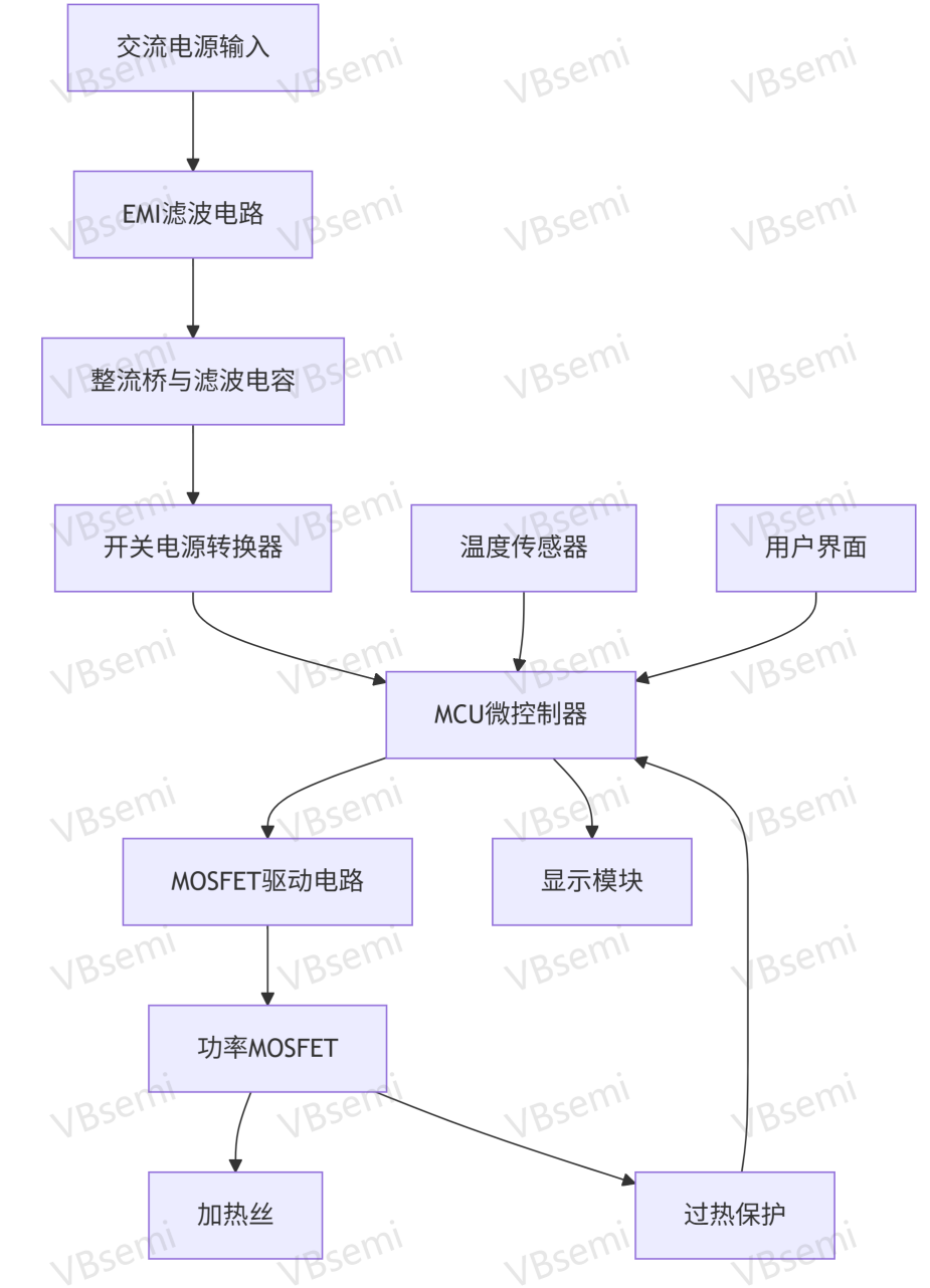 要理解MOSFET在养生壶中的重要性,我们首先需要了解养生壶的整体系统架构。以下是典型养生壶的系统拓扑结构: