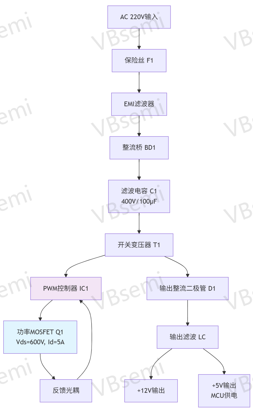 在开关电源中,MOSFET需要具备高击穿电压和快速开关特性。如VBE165R07S这样的高压MOSFET,为MCU提供稳定的5V/150mA电源。