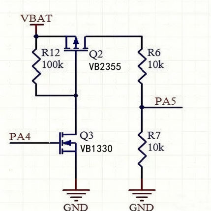 用一个 P-MOS (如 VB2355) 控制分压电路的电源端(高侧)。