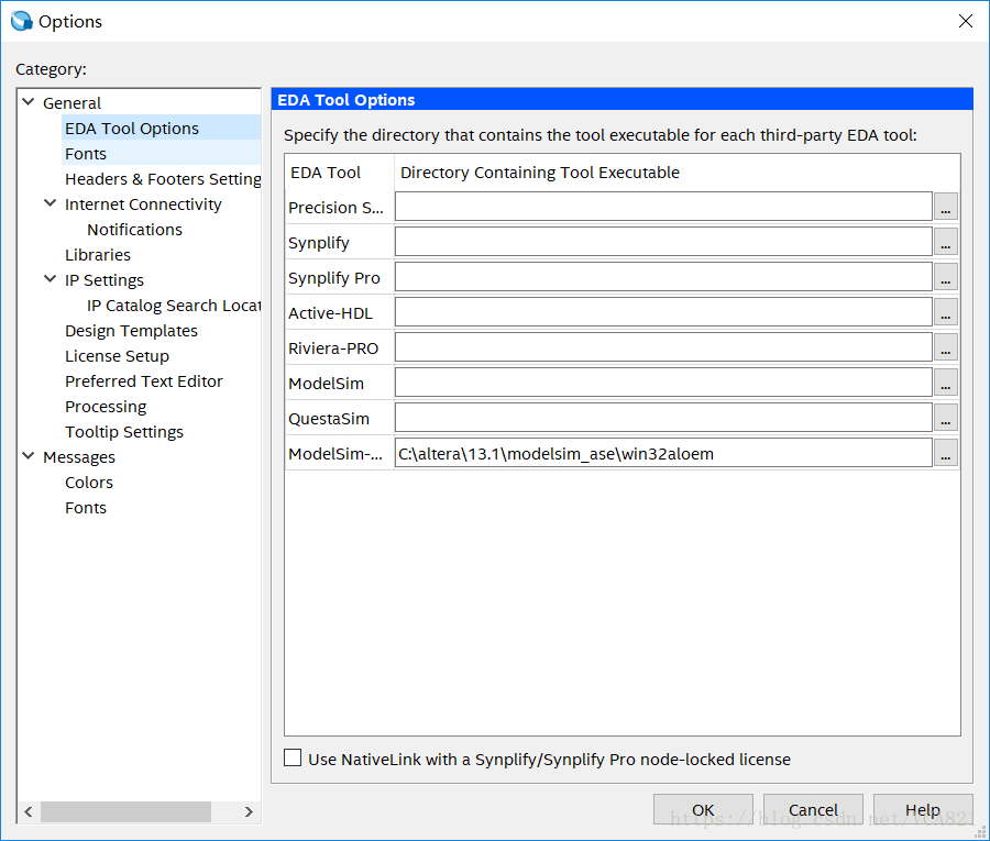 其次是设置关联,就是让quartus记录仿真软件位置好调用,选择工具栏Tools->Options,按照下图选择,