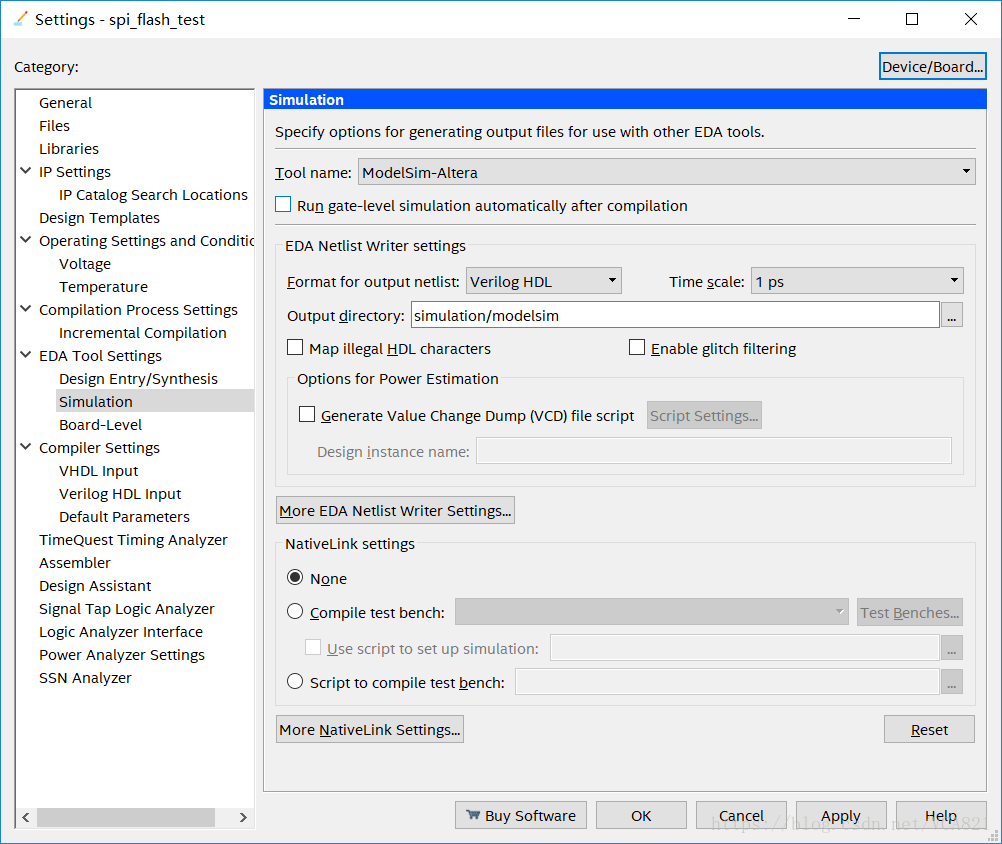 首先,打开工程后,根据下图点击工具栏Assignment->Settings...,选择Toolname,根据你的modlesim版本选择,笔者是modeisim-altera,注意下面的选项,Run gate-level simulation automatically after compilation,如果选择,每次编译完后会自动调用仿真工具(个人不建议开启,手动不麻烦),然后就是添加testbench文件的问题了,本次不加赘述。