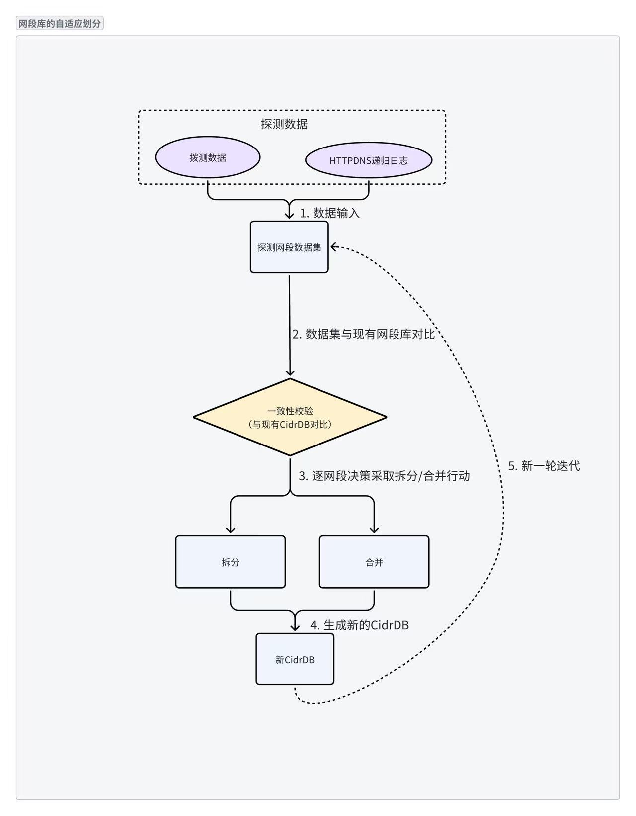 背景:外部 CDN 厂商的调度结果会随网络拓扑和调度策略持续变化,而静态网段库划分方式固定,难以实时跟踪调度结果变化。为解决这一问题,网段库动态划分算法通过“数据输入—一致性校验—网段调整—结果输出”的闭环流程,实现了网段库的自适应动态划分。
