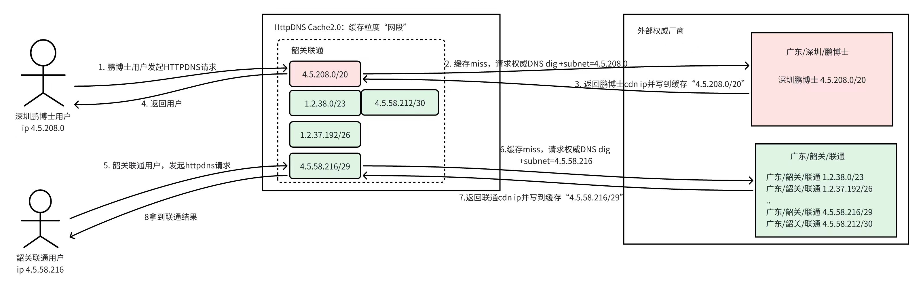 - 网段缓存:作为最高精度层级,聚焦高优先级业务场景 :一方面适配高优域名(如抖音 API 调用、图片分发、点播 / 直播流媒体传输等对精准性敏感的域名),另一方面服务重点集群(如 ToB 企业 HTTPDNS 服务、ToB 专属公共 DNS 服务),通过网段级细粒度缓存确保解析结果与用户实际网络链路高度匹配,降低访问延迟。