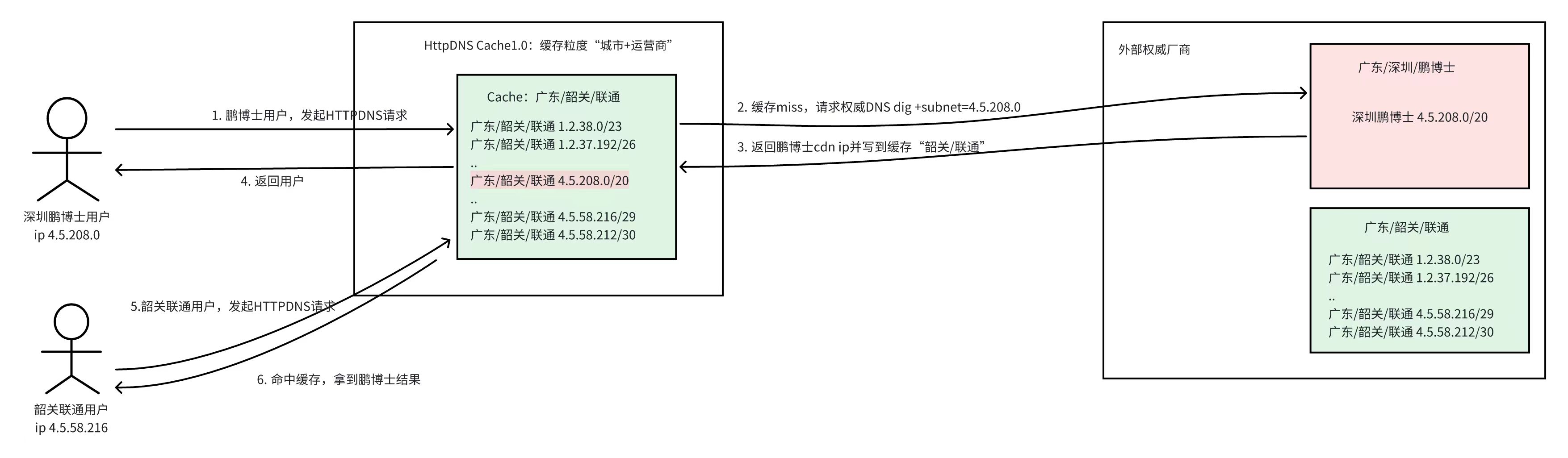 “省份 - 运营商”的缓存粒度方案,与 CDN 的 “省级节点 + 运营商线路” 划分逻辑一致,可确保HTTPDNS 缓存粒度与 CDN 节点调度粒度匹配。该方案的优势是缓存数量极少(国内省份 x 运营商仅百余条),缓存命中率高,回源少。 |