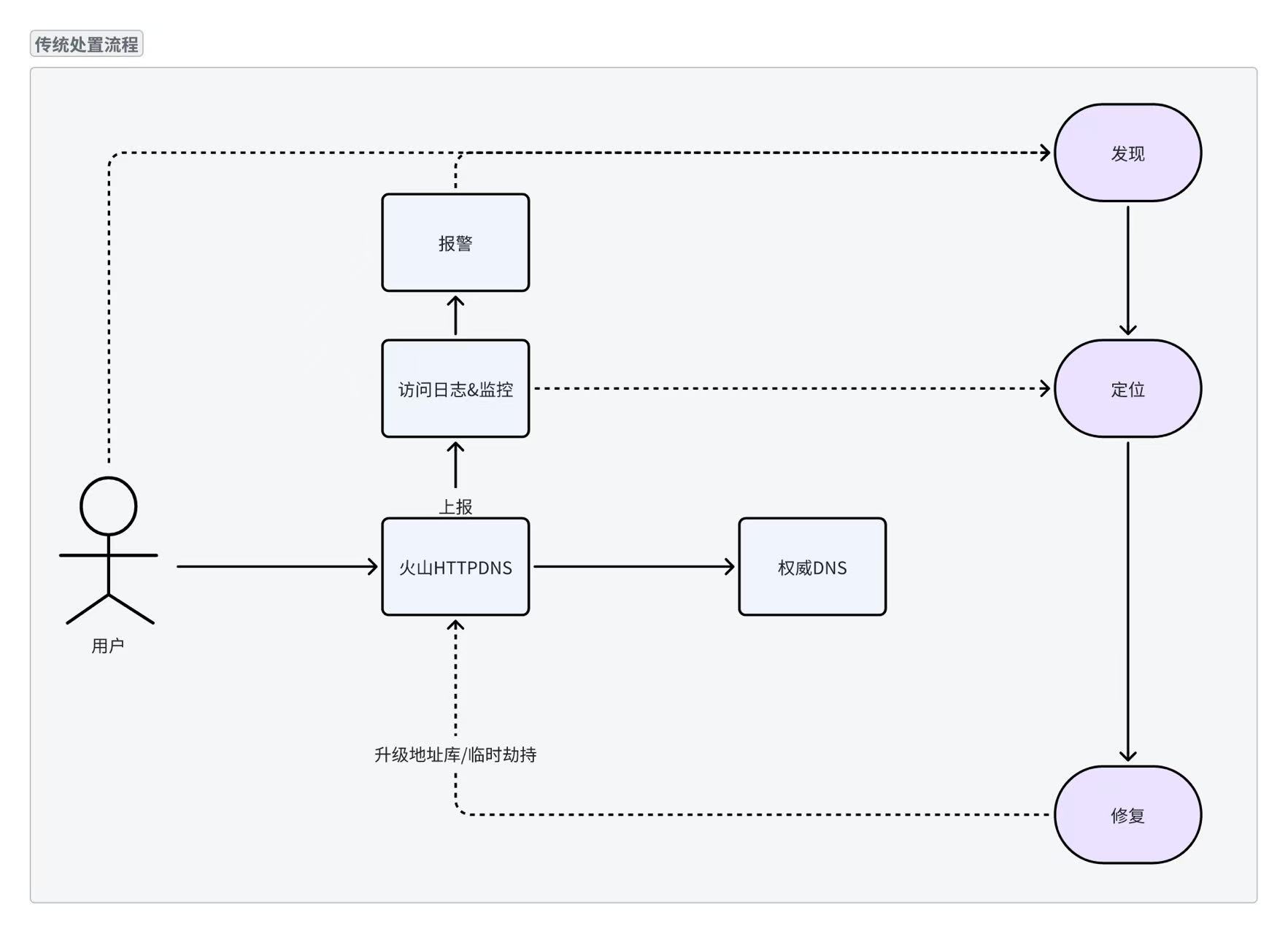 针对 HTTPDNS调度不准风险,业界主流处置流程采用 “发现 - 定位 - 修复” 三步闭环机制,具体如下: