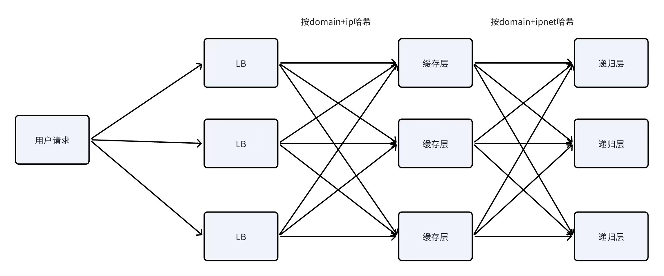 二级调度(缓存层→递归层):以“域名 + 网段” 为哈希键。以 “域名 + 客户端网段” 作为哈希键,与缓存粒度完全对齐,确保某一“域名 + 网段”对应的查询请求均定向到唯一的递归层节点。