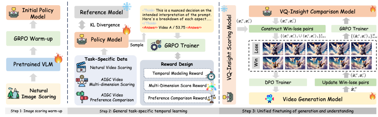 图像只捕捉视频的一个切片,用户真实的视频观看体验还取决于时间维度,例如运动是否自然?色彩是否在动态中稳定?因此,我们把Q-Insight的“推理式 + 强化学习”思路,拓展到自然视频和AIGC视频中,提出了推理式AIGC视频画质理解大模型VQ-Insight。该方法使用渐进式的视觉质量强化学习框架,包括图像打分预热阶段、任务驱动的通用时序学习阶段以及与视频生成模型的联合微调阶段。通过由易到难、由通用到具体的视频质量打分学习,仅使用少量数据就能教会AIGC视频偏好比较,AIGC视频多维度打分,自然视频打分等多项任务,并最终建立和下游生成模型的专项评估能力。同时,该方法引入时序建模奖励函数和长度控制奖励函数,鼓励大模型探索视频帧间的相关性和连贯性,并提供对于视频质量线索的丰富分析,增强偏好比较和分数回归的准确性。